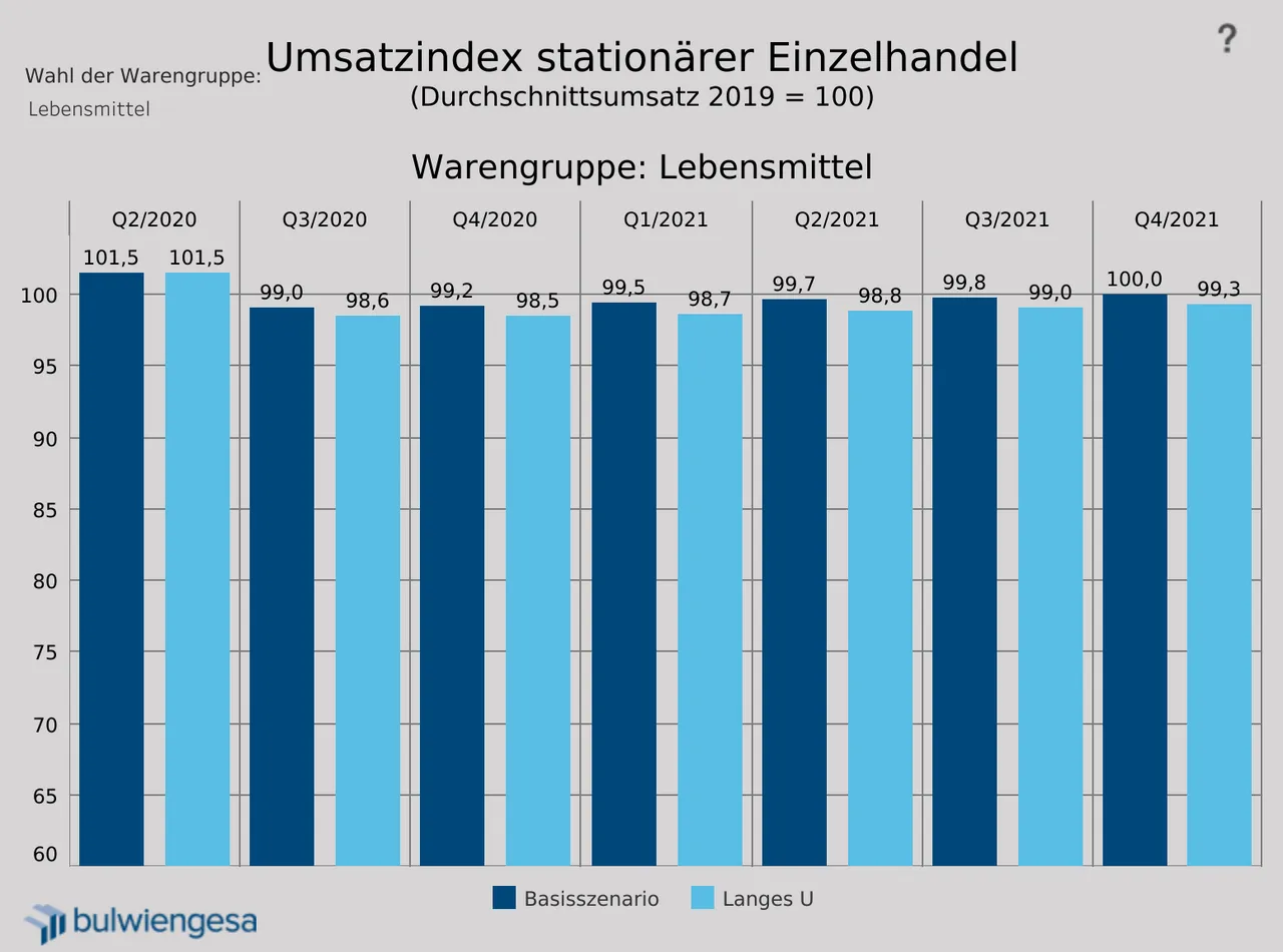 bulwiengesa hat zwei Szenarien gerechnet: ein Basisszenario sowie das Szenario „Langes U“. Die Wirkungen beider Szenarien wurden für die Umsatzentwicklung der Hauptwarengruppen im Einzelhandel eingeschätzt.