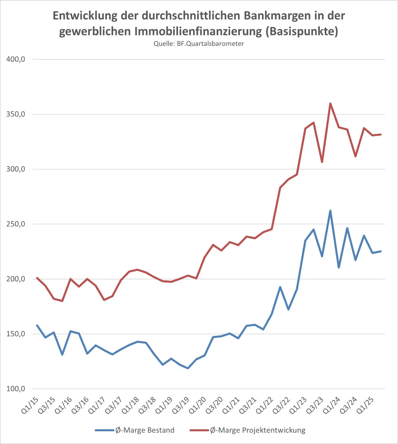 „In diesen Zahlen spiegelt sich auch die Krise der Projektentwickler wider. Die Banken waren zwischenzeitlich extrem risikoavers und haben die Margen deutlich angehoben. Die Zahlen zeigen auch, was Developments derzeit so schwierig macht. Die Projekte müssen nicht nur die höheren Zinsen tragen können, sondern auch die deutlich höheren Margen.“—Steffen Sebastian, Inhaber des Lehrstuhls für Immobilienfinanzierung an der IREBS und wissenschaftlicher Berater des BF.Quartalsbarometers