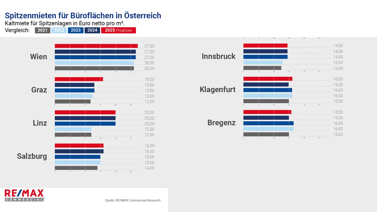 Aus heutiger Sicht erwarten die RE/MAX-Experten, dass der Büro-Immobilienmarkt auch in den weiterhin wirtschaftlich herausfordernden Zeiten ein wichtiger Treiber für den gewerblichen Immobilienmarkt bleiben wird. Jedoch benötigen Entscheidungsfindungsprozesse für Bürostandorte aufgrund geopolitischer Veränderungen, gestiegener Zinsen und Anzeichen einer schrumpfenden Wirtschaft heute tendenziell mehr Zeit, als das noch vor Covid-19 der Fall gewesen ist.