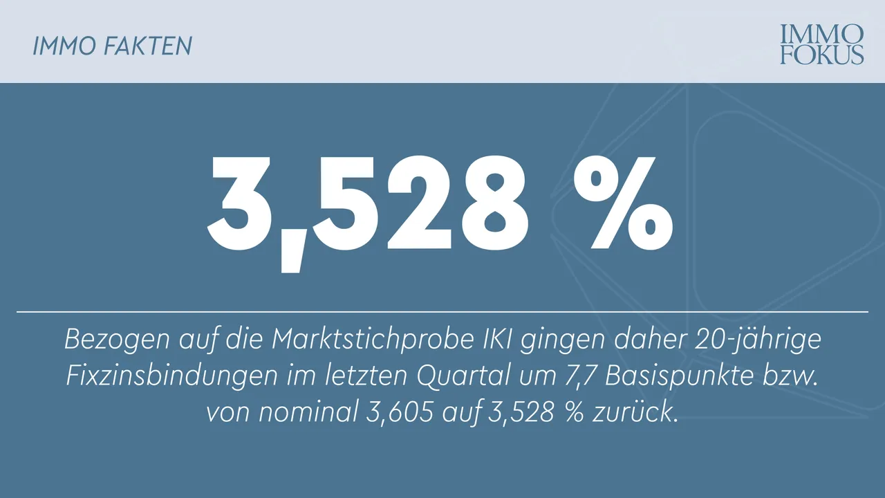 In den letzten Monaten hat sich der Zinsvorteil langjähriger Fixzinsbindungen aufgrund der weiteren Normalisierung der inversen Zinskurve merklich verringert: Die Differenz zwischen dem für variabel verzinste Kredite relevanten Referenzzins, 3-Monats-Euribor, und dem für 20-jährige Fixzinssätze bedeutenden 20-Jahres-EUR-Swapsatz hat sich in den vergangenen 12 Monaten bis zum 10. Januar 2025 um mehr als einen Prozentpunkt auf rund 0,20 Prozentpunkte reduziert. Noch nicht alle Kreditinstitute haben auf den jüngsten Zinsanstieg bei den langfristigen Konditionen reagiert. Bezogen auf die Marktstichprobe IKI gingen daher 20-jährige Fixzinsbindungen im letzten Quartal um 7,7 Basispunkte bzw. von nominal 3,605 auf 3,528 % zurück. Zuletzt bewegten sich 20-jährige Fixzinssätze in einer Bandbreite zwischen nominal 3,40 und 3,625 %.