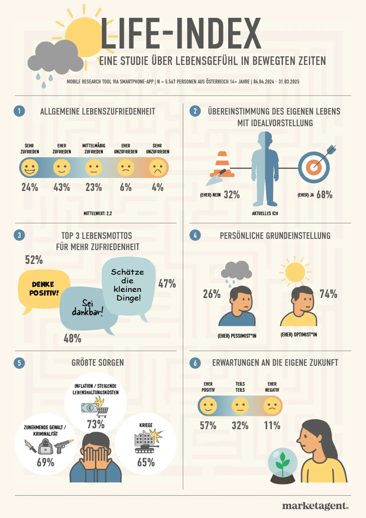 Wie zufrieden sind die Menschen in Österreich mit ihrem Leben – und was belastet sie? Der Life-Index von Marketagent mit mehr als 5.500 Befragten liefert Antworten auf diese Fragen und beleuchtet das Lebensgefühl der Bevölkerung inmitten globaler Krisen, wirtschaftlicher Unsicherheiten und gesellschaftlicher Spannungen.