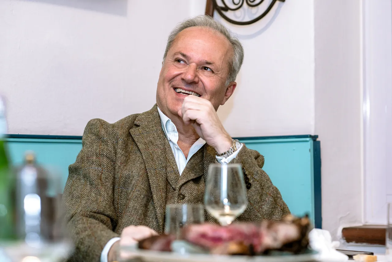 Wimmer-Lamquet war überpünktlich und wartet schon auf uns. Wir sitzen gleich neben der Küche, aus der es bereits herrlich duftet. „Ich sitze immer hier. Ich liebe den Platz“. Ein wenig eng – dafür erleben wir das Treiben in der Küche hautnah. „Warten Sie, bis unsere Bistecca alla Fiorentina gehackt wird. Ich liebe das Geräusch. Oder wenn die Zabaione gerührt wird – das höre ich einfach gern.“ Damit ist auch die Frage, was heute auf den Tisch kommt, rasch geklärt. „Bistecca alla Fiorentina vom Holzofengrill mit ein wenig Salz Patate und Spinaci“ – so wie es sich gehört."