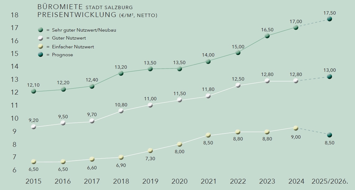 Laut SIX – der von Hölzl & Hubner Immobilien eigens entwickelte Salzburger Immobilien Index - wird ein weiterer Anstieg der Mieten am Salzburger Büromarkt prognostiziert. Vor allem betroffen sind die Lagen mit sehr gutem bzw. gutem Nutzwert. Büroflächen unter dem Anforderungsstandard sind schwer zu vermieten.