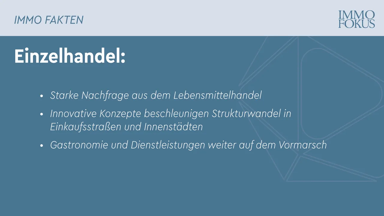 „Gastro, Service, Entertainment, Window Shopping und zumindest einen Teil der Einkäufe dann erst online von zu Hause abschließen, wird der Einkaufsbummel der Zukunft sein. Für den Markt für Einzelhandelsimmobilien bedeutet das eine tiefgreifende Änderung, aber letztlich mehr neue Chancen als Probleme.“