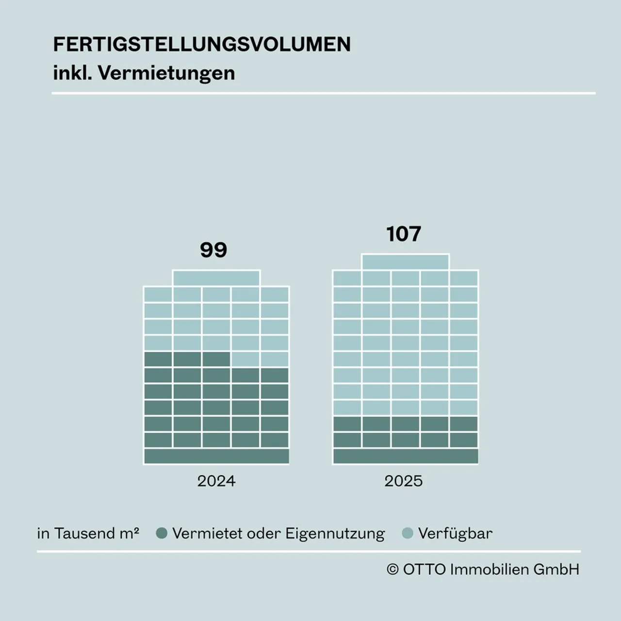 Steigende Neubauleistung und konstante Vermietungsnachfrage Im Jahr 2025 ist mit der Fertigstellung von insgesamt 107.400 m² Bürofläche zu rechnen. Der leichte Anstieg zeigt eine positive Tendenz, die auch im kommenden Jahr anhalten soll: Für 2026 ist eine Fertigstellung von knapp 125.700 m² prognostiziert, auch wenn einige Projekte noch auf Vorvermietungen warten, bevor der Baustart erfolgt. Mit Stand 4. Quartal 2024 waren nur rund 20.000 m² oder 19 % der neuen Flächen 2025 vorvermietet oder eigengenutzt.