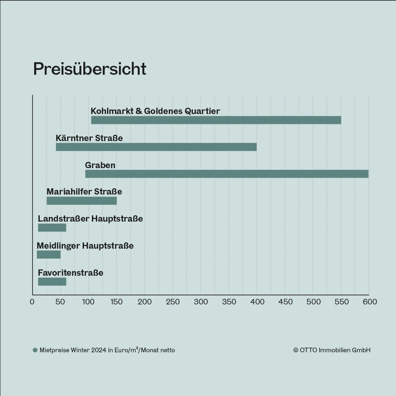 Die Mietpreise in den Wiener Einkaufsstraßen blieben weitgehend stabil. 2024 lagen die Spitzenmieten in Top-Lagen des ersten Wiener Bezirks wie dem Graben unverändert bei bis zu 600 Euro pro Quadratmeter. Auch die Mietpreise für kleine und mittelgroße Geschäftsflächen sind auf einem konstanten Niveau geblieben, trotz der Herausforderungen im stationären Einzelhandel. Bei größeren Flächen in B- und C-Lagen sowie auf der Mariahilfer Straße sind hingegen leichte Mietpreisrückgänge von bis zu 5 % zu verzeichnen. In der Wiener Innenstadt stieg der Leerstand in A-Lagen von 0,9 % (2023) auf 2,6 %.