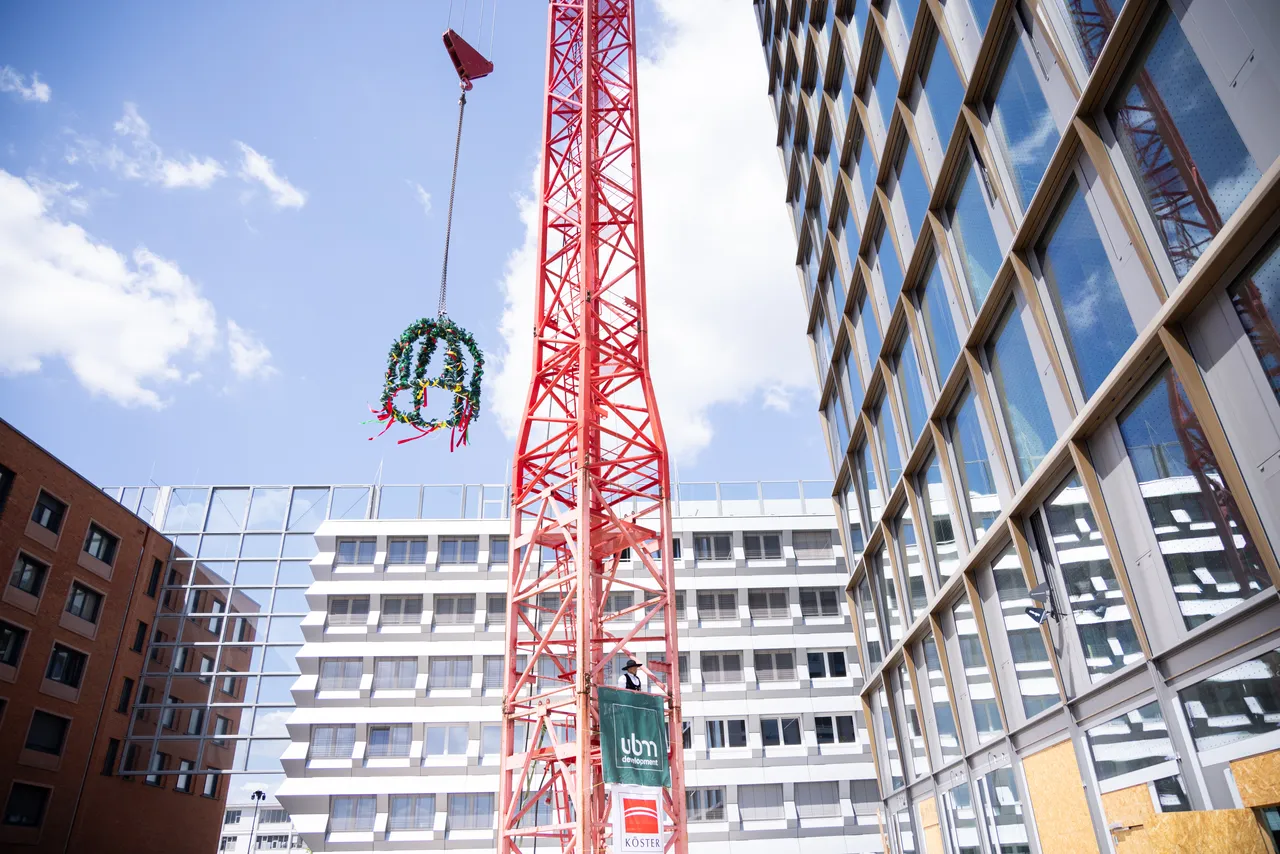 Der nächste grüne Meilenstein ist erreicht: Gemeinsam mit Projektpartnern und Gästen hat die UBM Development das Richtfest des ersten Holz-Hybrid-Hochhauses in Mainz gefeiert. Der Neubau Timber Peak (www.timber-peak.de) entsteht im dynamisch wachsenden Zollhafen Mainz. Nach seiner Fertigstellung Ende 2025 gibt es New-Work-Arbeitsplätze auf zwölf Stockwerken in bis zu 40 Metern Höhe. Das Gebäude wird ab Frühjahr 2026 bezugsfertig sein.