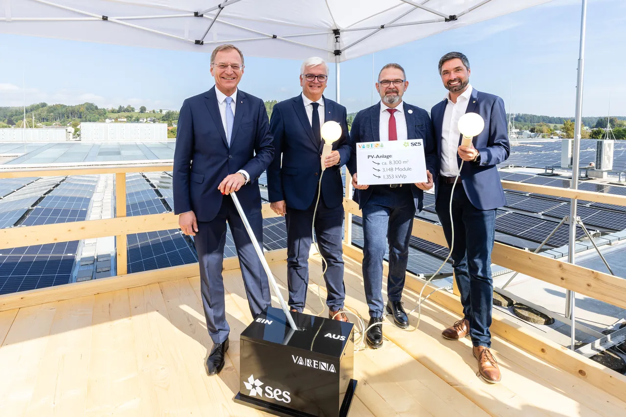 Landeshauptmann Thomas Stelzer gab am Mittwoch im Rahmen einer Pressekonferenz den offiziellen Startschuss zur Inbetriebnahme der neuen Photovoltaik-Anlage am Dach des Shopping-Centers VARENA in Vöcklabruck. Gemeinsam mit Marcus Wild, SPAR-Vorstand und Vorsitzender des SES Aufsichtsrats, Thomas Krötzl, Center-Manager der VARENA, sowie dem Vöcklabrucker Bürgermeister Peter Schobesberger konnte er somit eine der leistungsfähigsten Photovoltaik-Anlagen der Region ihrer Bestimmung übergeben.