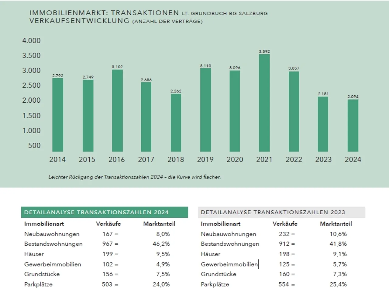 Die Analyse des Jahres 2024 offenbart erneut einen Rückgang der Verkaufszahlen und teilweise auch der Preise auf dem Salzburger Immobilienmarkt. Hohe Zinsen, bedingt durch die anhaltend hohe Inflation der letzten Jahre, sowie die weiterhin schwierigen Finanzierungsbedingungen haben zu dieser Entwicklung beigetragen. Bei Bestandswohnungen, Häusern und Grundstücken wurde ein Preisrückgang verzeichnet. Auch die Anzahl der Transaktionen und das Gesamtumsatzvolumen sind gesunken. Im Gegensatz dazu stiegen die Preise für Neubauwohnungen deutlich, während die Transaktionszahlen in diesem Segment zurückgingen.