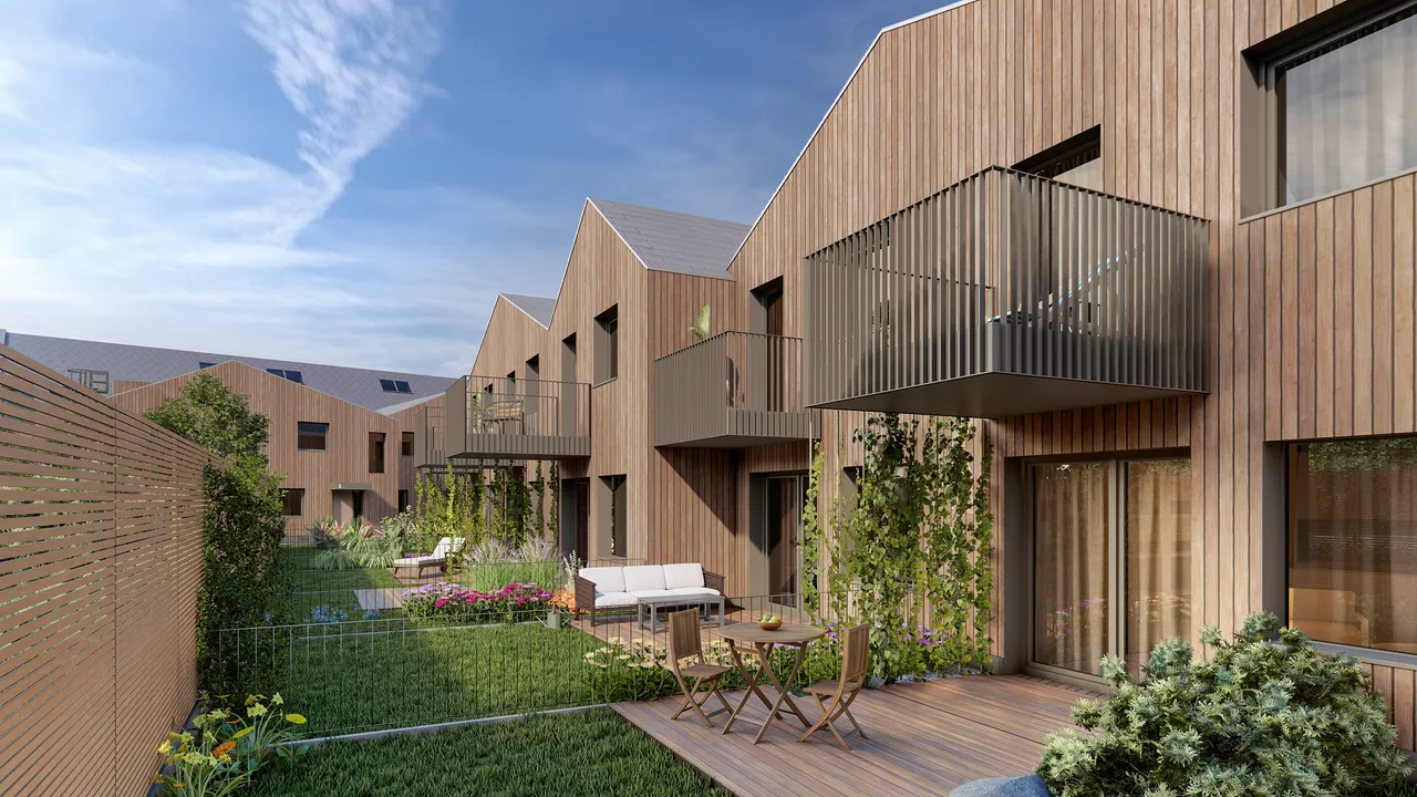 Die Wohnungen in den Reihenhäusern erstrecken sich über ein Erdgeschoß und ein Obergeschoß mit vier oder fünf Zimmern. Jedem Reihenhaus ist ein Eigengarten zugeordnet.