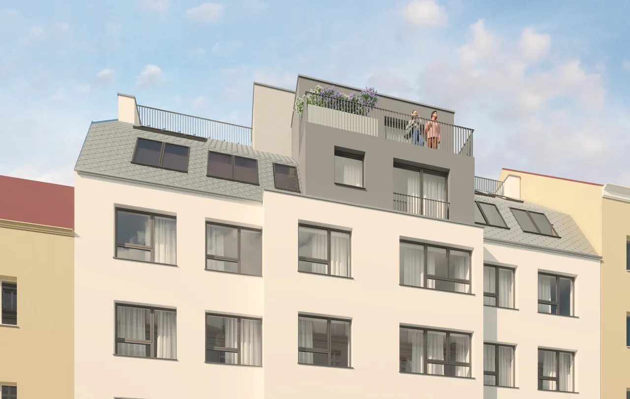 Die 17 Wohnungen verteilen sich auf drei Ober- und zwei Dachgeschoßen. So gestaltet sich die Aufteilung der Freiflächen unterschiedliche: Während die Wohnung im Erdgeschoß über eine Terrasse und Garten verfügt, haben die östlich oreintieren Wohnungen in den Obergeschoßen einen Balkon, westlich ausgerichtete Wohnungen sind mit einem Erker ausgestattet. Ein Dachgeschoß beherbergt drei Wohnungen, das zweite eine Dachwohnung inklusive Terrasse. Für ede Wohnung gibt es ein eigenes Kellerabteil. Die Energieversorgung des Wohnbaus erfolgt mittels Fernwärme.